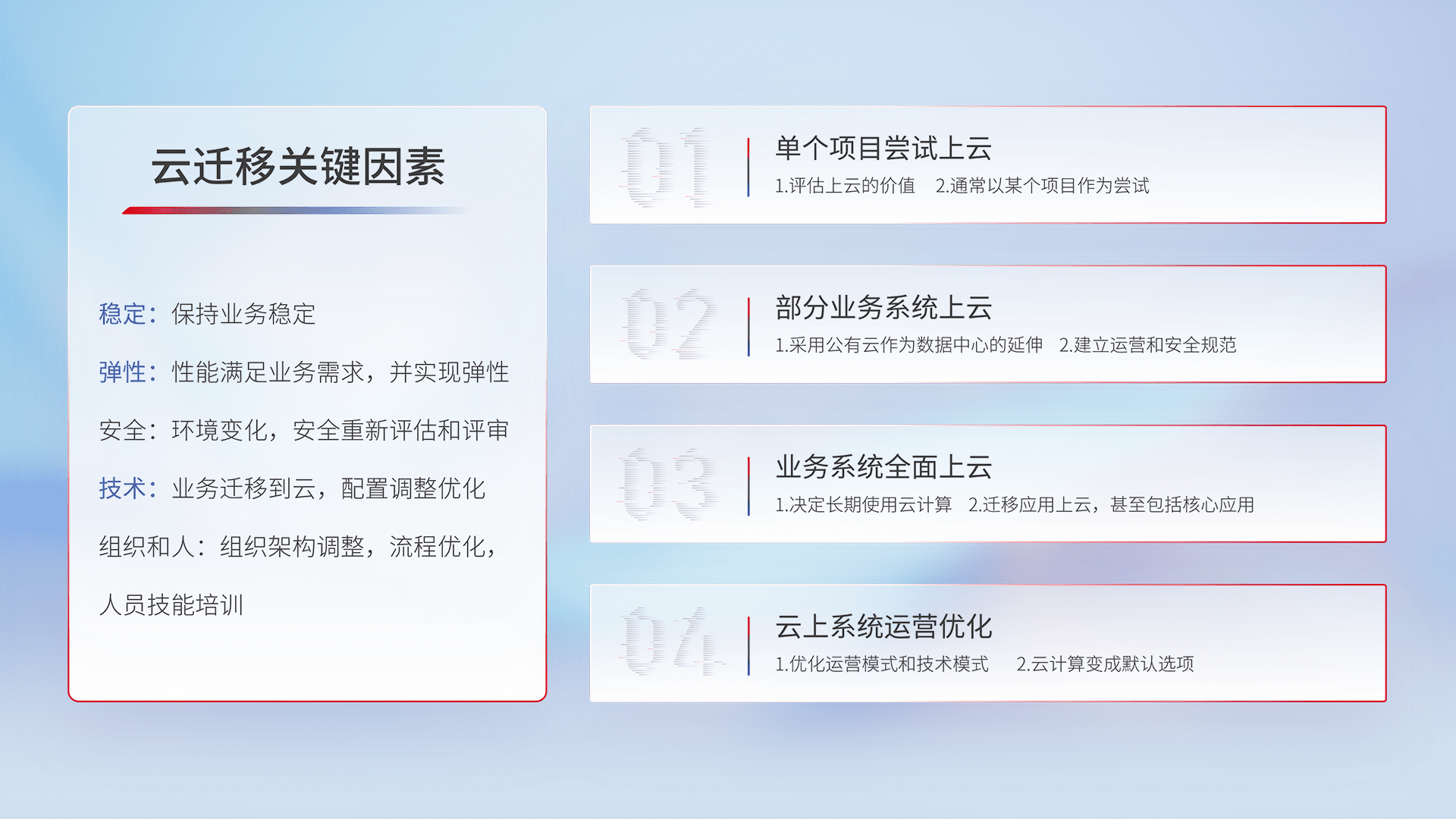 结合实际业务,,从规划设计、、云平台选型、、、云原生改造、、数据迁移、、集成交付,,,,迁移全过程为客户识别最佳上云路径,,,,做好风险识别管理,,,,设计网络架构、、、身份权限、、、安全审计合规、、、、操作审计、、日志审计、、、监控告警策略、、、、多站点容灾设计等,,,,对云上基础设施进行整体规划,,提升IT治理水平,,以满足弹性、、、、高可用、、、高性能的需求。。。
