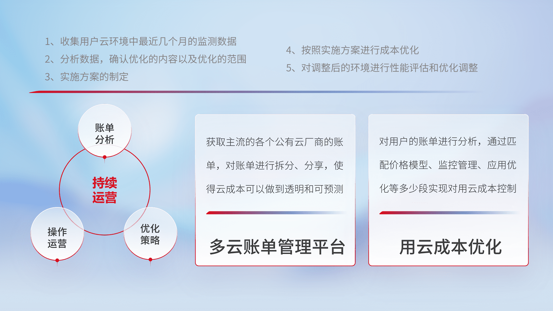 通过多云纳管,,,,以统一的资源数据模型把客户的云资源进行抽象和封装,,,进而实现对多云资源的统一操作,,,保障云资源管理的可靠性、、、稳定性与可用性。。。。量身定制化运维内容,,,,配置、、、、开发运维、、补丁管理、、、备份、、、、监控、、认证和访问管理、、审计和日常巡检等,,,保障在用云过程中的可靠度,,,稳定度以及高可用率。。。
